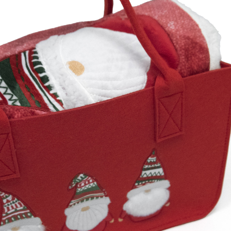 Morbidissimo plaid Folletti confezionato in una pratica e graziosa borsa in feltro, ideale per trasportarlo o per riporlo con stile. Da un lato, il plaid ha una divertente applicazione a forma di babbo natale, mentre l’altro lato è realizzato con un effetto peluche in tinta unita. La borsa è arricchita con una simpatica applicazione coordinata, che la rende perfetta anche come complemento d’arredo. Questo plaid è l’ideale per coccolarsi nelle serate fredde, aggiungendo un tocco di dolcezza e comfort alla casa.