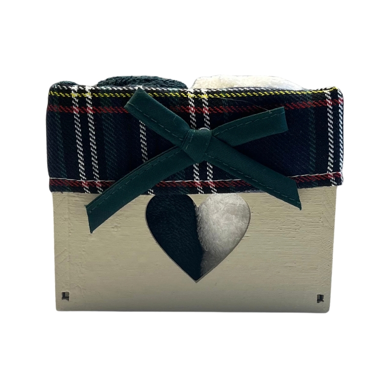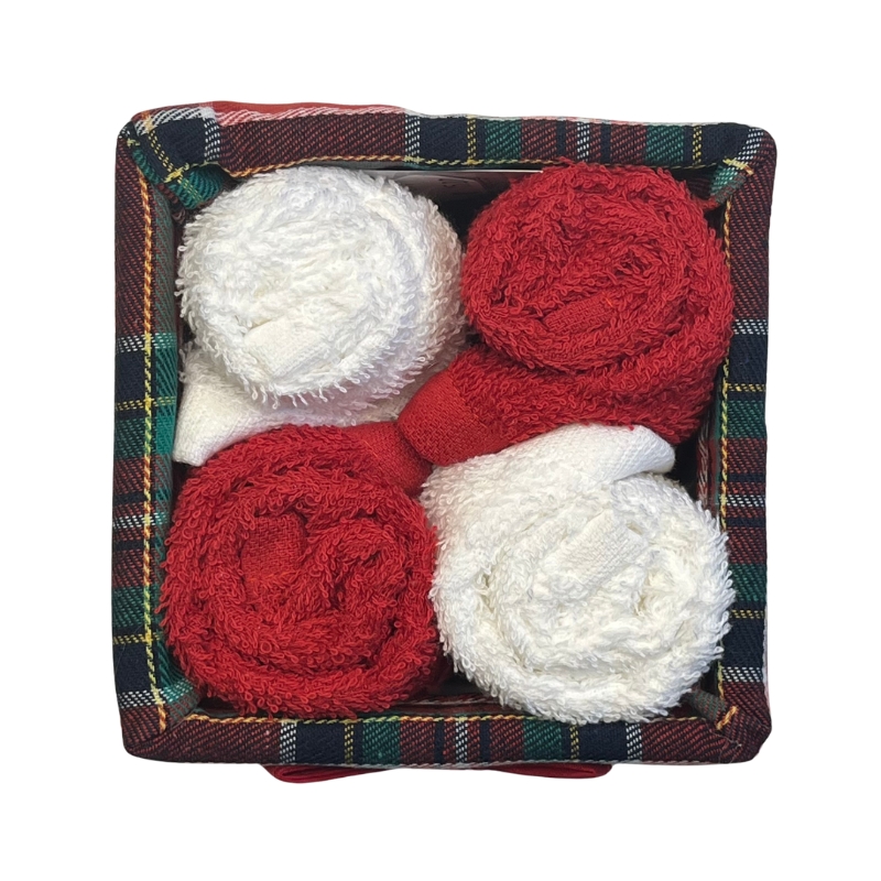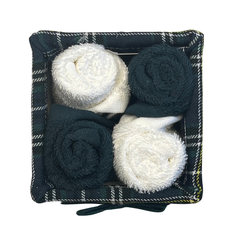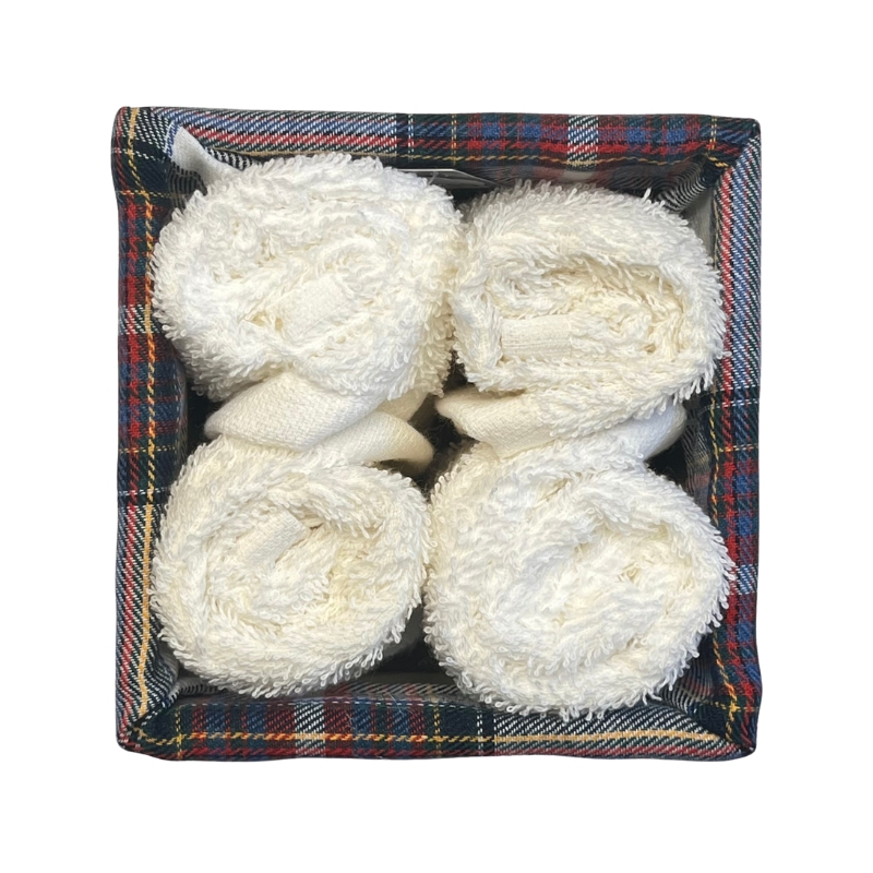 Il set di 4 lavette Tartan è realizzato in morbida spugna di puro cotone, ideale per la cura quotidiana del viso e delle mani. Ogni set è presentato in una raffinata vaschetta di legno con bordo in fantasia tartan, perfetta anche come idea regalo o elemento decorativo per il bagno. La variante Verde e la variante Rossa includono due lavette bianche e due lavette in tinta. La variante Naturale comprende quattro lavette dello stesso colore. Un accessorio elegante e pratico per aggiungere stile scozzese al tuo bagno.
